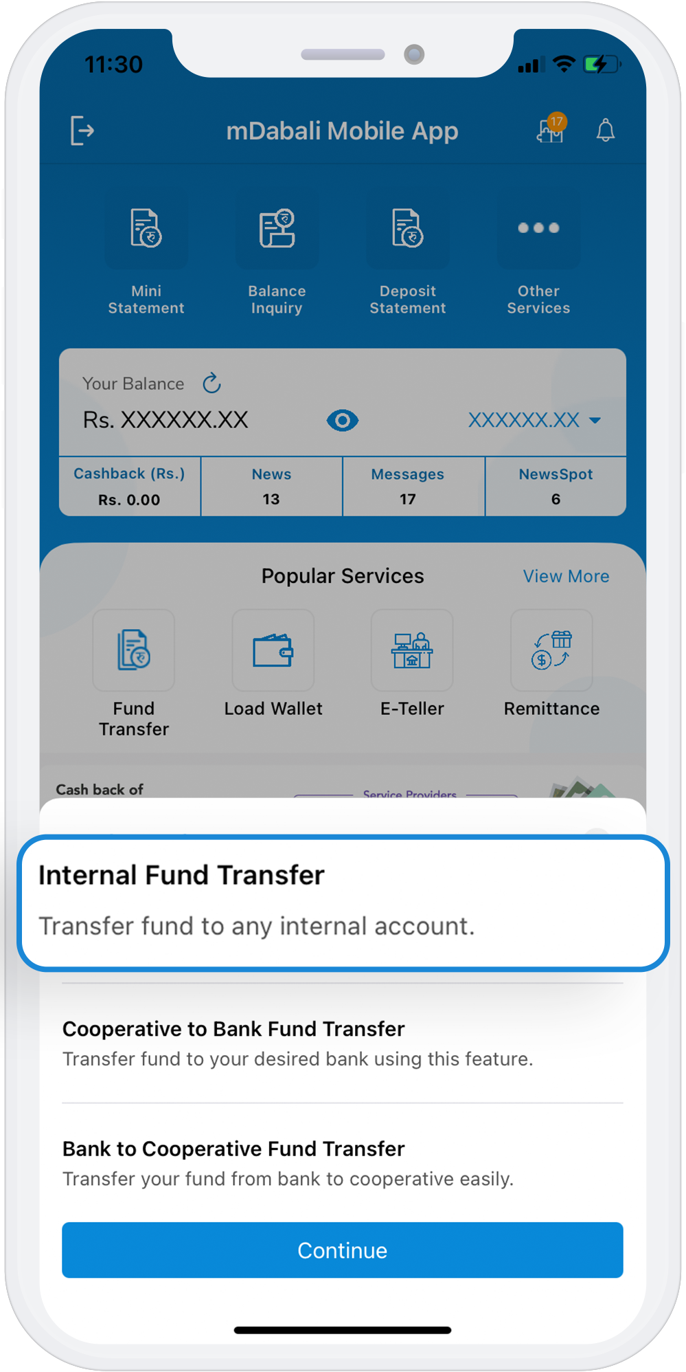 Customers of Cooperatives/Microfinance using mDabali for their mobile banking can transfer funds easily within their cooperative accounts. For eg. Customers of ABC Cooperative/Microfinance can transfer funds to any other accounts in ABC Cooperative/Microfinance.