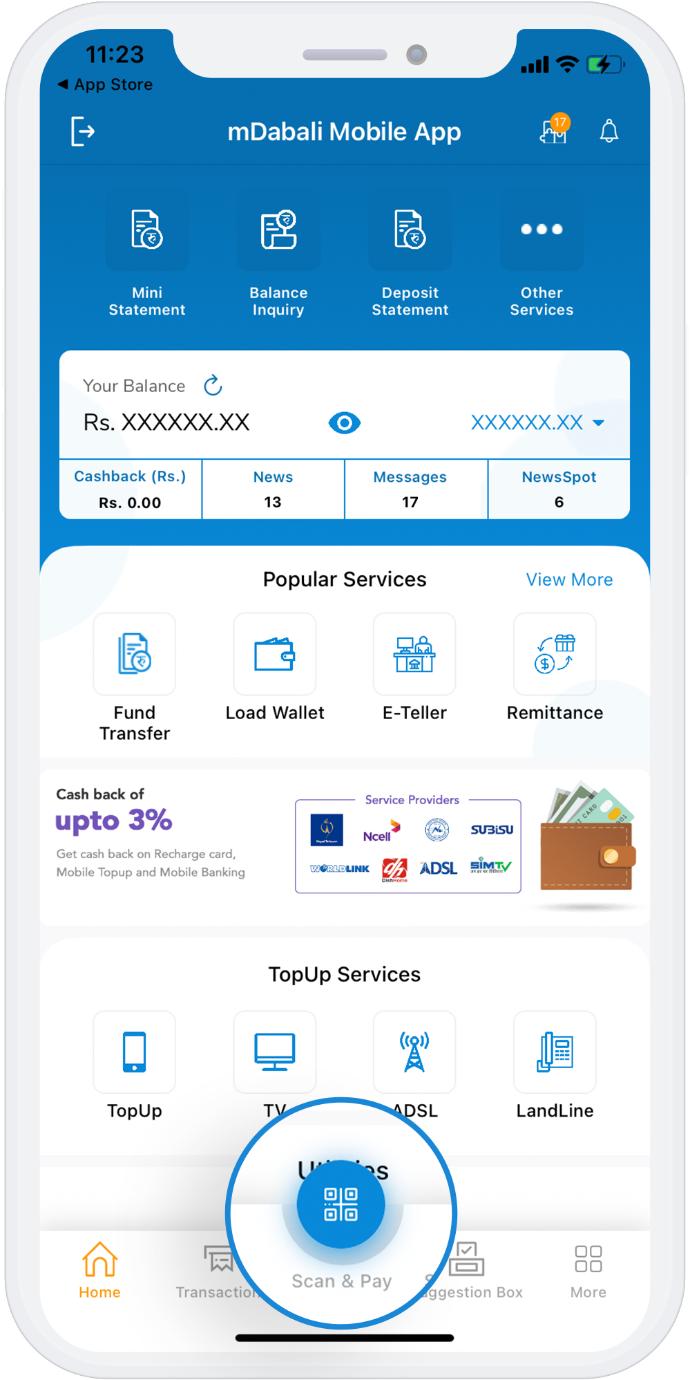 Tap on the “Scan & Pay” button available at the bottom center of the homepage